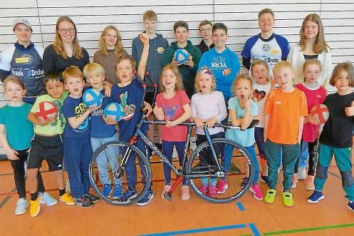 Vier Tage lang stürmten 72 Kinder die Anne-FrankSchule, die Ludwig-Uhland-Schule und zwei städtische Sporthallen sowie den „roten Platz“. Es gab Schnupperkurse in den Sportarten Badminton, Kunstrad/ Radball (im Bild mit Gruppe 1 – den „kleinen“ Im Speck), Fußball, Tanzen und Turnen. Neben dem RSV (Radsportverein) war auch der TSV Wendlingen mit am Start.